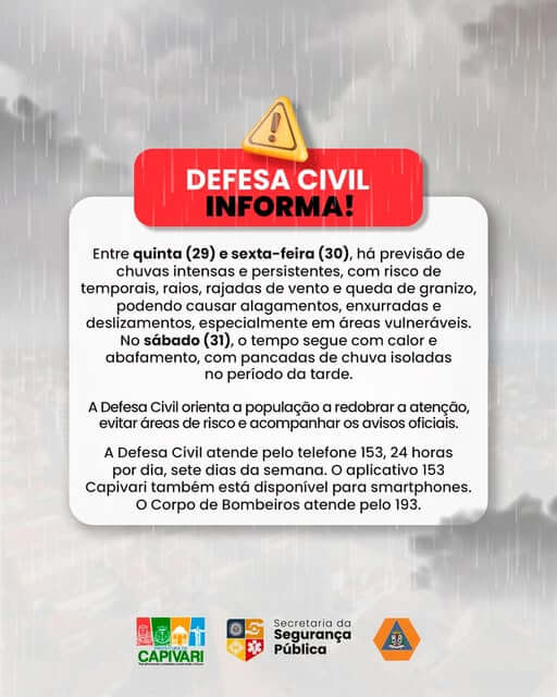A Defesa Civil orienta que a população acompanhe os alertas oficiais e adote medidas preventivas para minimizar os impactos das condições adversas. Em caso de necessidade, a corporação e a Guarda Civil atendem pelo 153, 24 horas por dia, sete dias por semana. O aplicativo 153 Capivari também está disponível para smartphones. O Corpo de Bombeiros atende pelo 193.