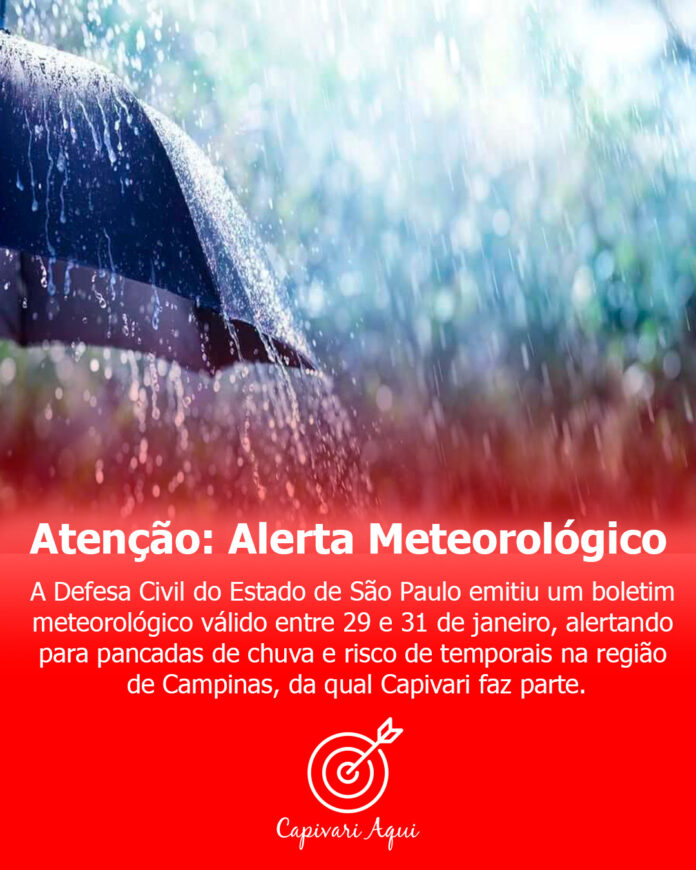A Defesa Civil do Estado de São Paulo emitiu um boletim meteorológico válido entre 29 e 31 de janeiro, alertando para pancadas de chuva e risco de temporais na região de Campinas, da qual Capivari faz parte.