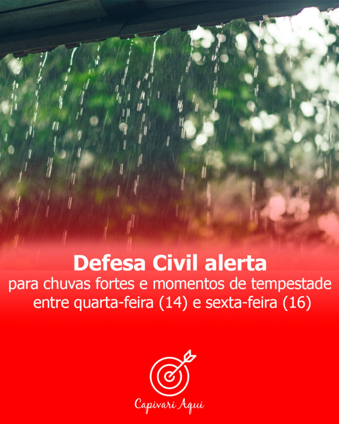 A Defesa Civil do Estado de São Paulo informa que, entre quarta-feira (14) e sexta-feira (16), a atuação de um sistema meteorológico próximo à Região Sudeste do Brasil deverá influenciar o regime de chuvas no território paulista, favorecendo a ocorrência de chuva forte, com momentos de tempestade, acompanhadas por descargas elétricas, rajadas de vento e possibilidade de queda isolada de granizo em diversas regiões do Estado.