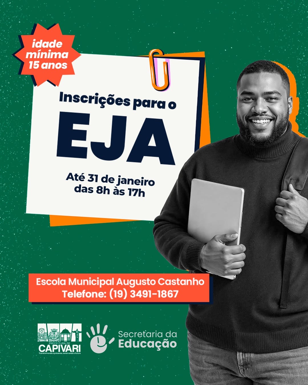A Secretaria da Educação informa que as inscrições para a Educação de Jovens e Adultos (EJA) estão abertas até o dia 31 de janeiro de 2026, na Escola Municipal Augusto Castanho, no Centro. Podem se inscrever jovens e adultos com 15 anos ou mais para as aulas do segundo semestre.